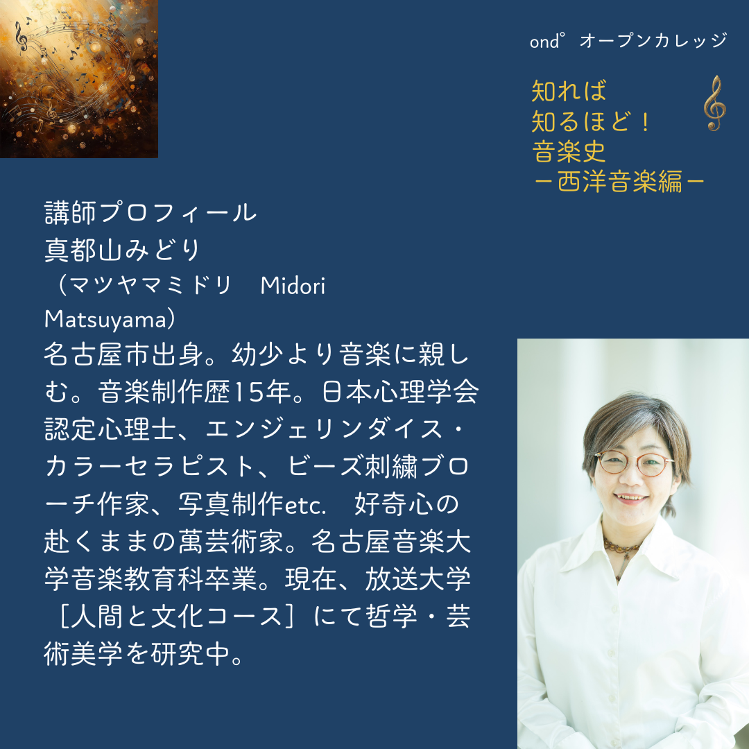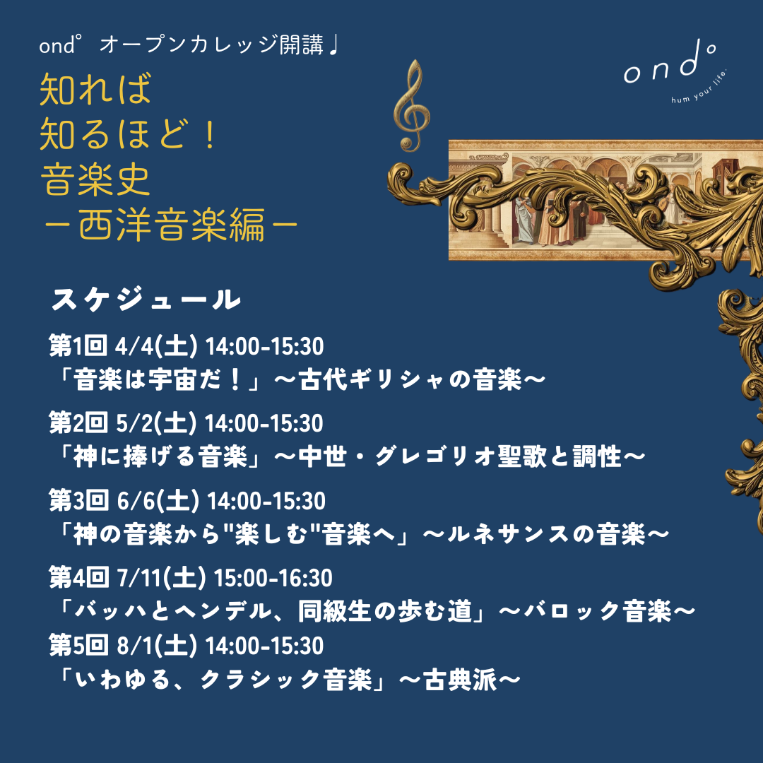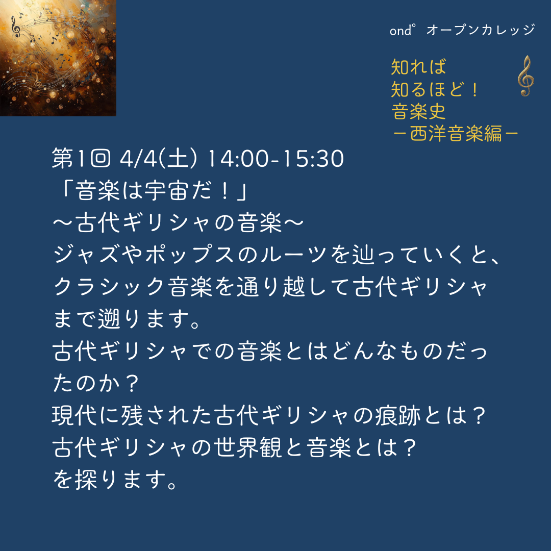 4月4日(土) / ond°オープンカレッジ開講♩知れば 知るほど!音楽史 -西洋音楽編-第1回「音楽は宇宙だ!」 〜古代ギリシャの音楽〜 講師:真都山みどり